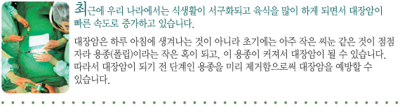 ´ëºÎºÐÀÇ ´ëÀå¾ÏÀº ¼±Á¾¼ºÆú¸³(¿ëÁ¾)À̶ó´Â Àü¾Ïº´º¯À» °ÅÃÄ ¹ß»ýÇÕ´Ï´Ù. µû¶ó¼ ÀÌµé ¼±Á¾¼ºÆú¸³ÀÌ ¾ÏÀ¸·Î ÁøÇàÇϱâ Àü¿¡ ¹ß°ßÇÏ¿© Ä¡·áÇÑ´Ù¸é ´ëÀå¾ÏÀÇ ¹ß»ýÀ» ¿¹¹æÇÒ ¼ö ÀÖ½À´Ï´Ù.